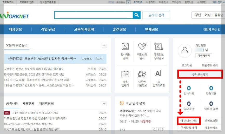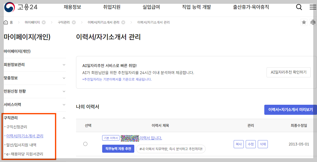 - 워크넷 사이트에 접속해 이력서와 자기소개서를 작성합니다.