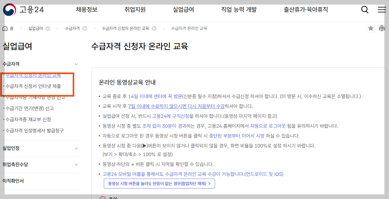 구직신청이 완료되면, 수급자격 신청자 온라인 교육을 들어야 합니다. 이 교육은 고용보험공단 사이트에서 수강할 수 있으며, 약 1시간 정도의 시간이 소요됩니다.